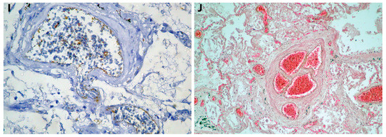 Case No. 4 from our study presented with a plexiform lesion (Figure 2J), a hallmark of severe pulmonary hypertension [30]. ARDS can be frequently complicated by pulmonary hypertension. Physiopathologically, pulmonary hypertension is caused by vascular obstructions, pulmonary vasoconstriction, and microthrombosis. Subsequently, in the subacute and chronic phases of ARDS, the vascular remodeling and proliferation of smooth muscle cells contribute to the development of pulmonary hypertension [31,32,33]. The prevalence of pulmonary hypertension in patients with COVID-19 is 12% [34]. In addition, the studies show that pulmonary hypertension may be a long-term sequela of COVID-19, which may be a major public health issue in the future [35]. Although we do not have the antemortem clinical data in the case No. 4, we consider that the plexiform lesion is not correlated directly with COVID-19: most studies show that it takes a few weeks until the plexiform lesions appear after the establishment of severe pulmonary hypertension [36,37].