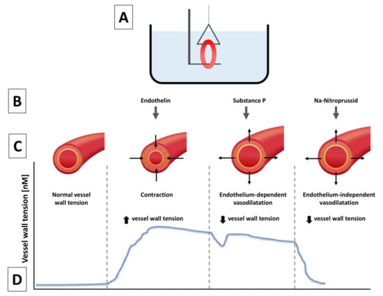 Illustration of In Vitro Measurements of Coronary Vasomotor Reaction (A) Schematic presentation of a bath chamber with a myograph and its L-shaped pins. A coronary vessel is mounted on the pins. (B) Drugs added into the bath chamber. (C) Schematic of the coronary arteries and their response to different compounds. (D) Representation of coronary vessel wall tension in response to the different compounds.