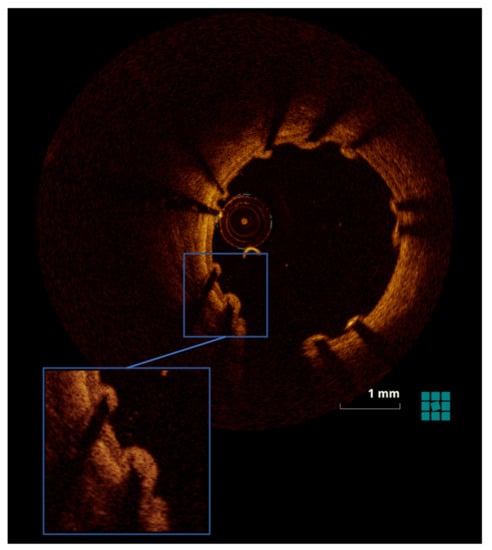 To perform OCT measurements, we used LightLab Imaging software, as previously described []. To quantify the peri-strut tissue burden, i.e., structures on the struts most likely to be a thrombus and/or fibrin, we used a semi-quantitative score [].