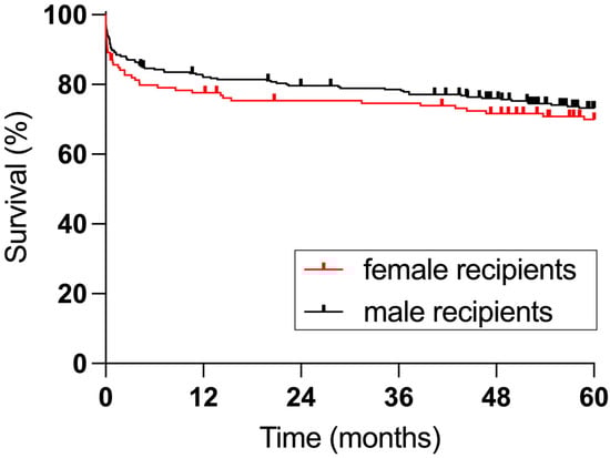 Patient survival was comparable between female and male recipients (Figure 1). In female recipients, patient survival was 77.6% at one year and 70% at five years. In male recipients, patient survival was 82.1% at one year and 73.3% at five years. Neither in female nor in male recipients was five-year patient survival affected by recipient-donor sex-concordance (Figure 2).