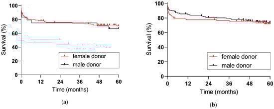 Five-year patient survival according to donor sex: (a) female recipients (p = 0.6909), (b) male recipients (p = 0.5882).