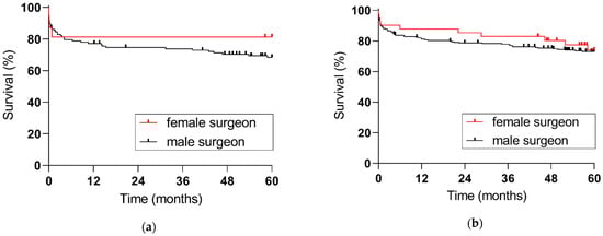 Five-year patient survival with regards to surgeon sex: (a) female recipients (p = 0.3621), (b) male recipients (p = 0.7238).