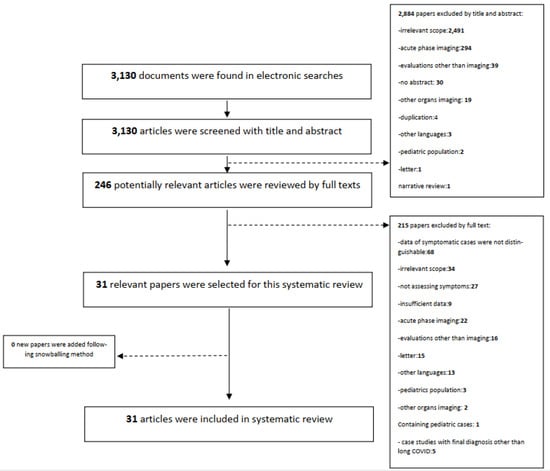 Our literature search identified a total of 3130 articles. After title and abstract screening, we removed 2884 papers, while a further 215 articles were removed after full text screening, leaving 31 articles for data extraction. Primary reasons for paper exclusion during the title and abstract screening stage were as follows: non-COVID-19 diseases, addressing the technical aspects of artificial intelligence usage in COVID-19 lung imaging, imaging findings being reported only from the acute phase of COVID-19, and non-lung imaging findings. During full text screening, several articles were excluded as data from symptomatic patients could not be distinguished from the data of asymptomatic ones (N = 68). Other reasons for exclusion during the full text screening step included: topics irrelevant to the aim and scope of our systematic review (N = 34), not assessing symptoms in the follow-up evaluation (N = 27), insufficient information about participants or intervention such as, participants age range, evaluation time, COVID-19 diagnosis method, etc., that caused them not to fulfill our inclusion criteria clearly (N = 9), and case-reports with final diagnoses other than long COVID (N = 5). The flowchart of the screening process, as well as the exclusion reasons for each step, is provided in Figure 1.