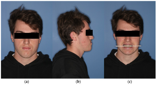 Extraoral view of the patient preoperatively. (a) En-face image. (b) Profile view from right (c) Frontal image showing the occlusal plane.