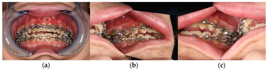 Clinical view from intraoral. (a) Frontal view in final bite position. (b) Posterior region left in occlusion. (c) Posterior region right in occlusion with presentation of the skeletal class III anomaly with circular crossbite and nonocclusion in the anterior region.