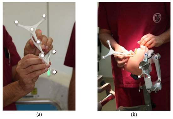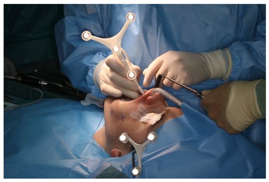 After vestibular incision from the right first molar to the left first molar and formation of a mucoperiosteal flap, the navigation probe was registered in accordance with the above scheme. The marker was positioned in direct sight of the optical cameras on the left side of the patient so as to not interfere with the surgeons, who were positioned to the left and right sides of the patient. A corresponding point-pair matching, according to the above-mentioned scheme, was performed (Figure 7).