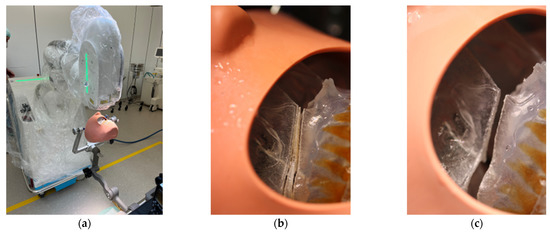 All participants wore laser protective goggles during the rehearsal. After retraction of the soft tissue dummy, the robot arm was postured in the preplanned position with the soft tissues omitted. The robot-guided laser performed the osteotomy autonomously, while still under direct control by the surgical team (Figure 6). This was accomplished without any problems, so we proceeded to mark the planned drill holes for the PSI in the 3D model using a laser beam. For this purpose, the existing data sets were overlaid with the planned PSI and also transferred to the CARLO® device. Each drill hole was defined in advance, as well as the corresponding angle of incidence of the laser beam on this point. Due to the position and anatomy of the 3D model, several different angles of incidence had to be selected in order to fall approximately perpendicularly on the surface of the maxillary surface. This marking also succeeded without any problems.
