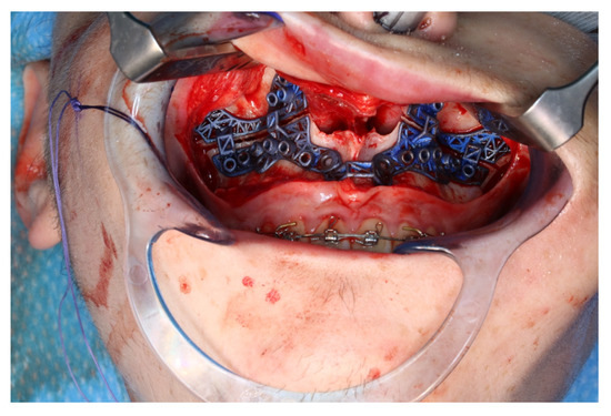 The osteotomy of the maxilla took approximately 45 min for both sides, including spot-marking of the drilling holes (Figure 9). After the osteotomy had been performed, the CARLO® device was removed, and positioning of the osteotomy lines as well as spot marking were clinically checked by superimposing the cutting guide (Figure 10). Afterwards, the osteotomy of the nasal septum, lateral nasal wall, and pterygomaxillary junction was completed using a chisel and hammer. The surgery was then completed in a conventional manner (Figure 11).