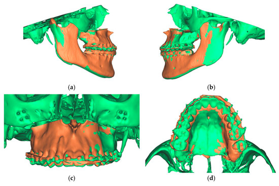 Overlay of the planned maxillary and mandibular position (green) with the postoperative position (orange). (a) View from the right (b). View from the left (c). View of the maxilla (d). View from palatal to the maxilla.