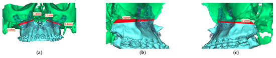 Representation of the segmented maxilla (blue) from the rest of the facial skull (green), and representation of the deviation of the osteotomy lines from the planned course in mm (red). (a) View from front (b). View from right (c). View from left.