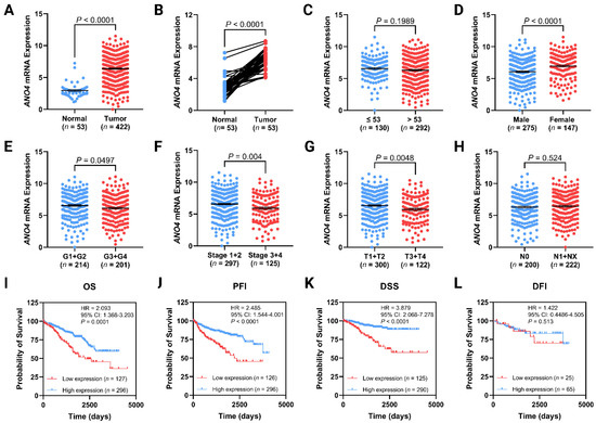 Differential expression of ANO4 between normal kidney tissues and tumor samples (A) and its age and gender-matched comparison (B). The correlation between ANO4 expression and clinicopathological variables including age (C), gender (D), grade (E), stage (F), pT (G), and pN (H). Kaplan–Meier curves demonstrating the impact of ANO4 expression on the OS (I), PFI (J), DSS (K), and DFI (L). Data are presented as mean ± SEM.