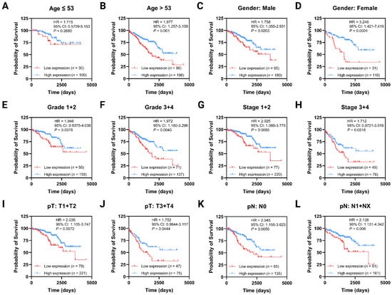 Kaplan–Meier curves demonstrating the impact of ANO4 expression on the OS within subgroups of dichotomized demographics and clinicopathological variables including age (A,B), gender (C,D), grade (E,F), stage (G,H), pT (I,J), and pN (K,L).