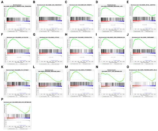 GSEA plots illustrating significantly enriched pathways in low (A–M) and high (N–P) ANO4 expression groups.