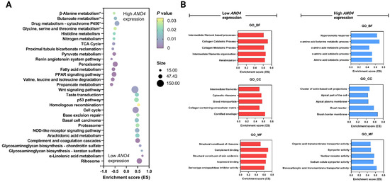 Figure 4A represents the top 15 KEGG-enriched pathways within low and high ANO4 expression groups. The poor prognostic effect of ANO4 downregulation is hypothesized to be mediated through the following pathways: ribosome (ES: 0.57, p < 0.001), α-linolenic acid metabolism (ES: 0.71, p = 0.00177), glycosaminoglycan biosynthesis–keratan sulfate (ES: 0.68, p = 0.010695), glycosaminoglycan biosynthesis–chondroitin sulfate (ES: 0.61, p = 0.006689), complement and coagulation cascades (ES: 0.49, p < 0.001), arachidonic acid metabolism (ES: 0.48, p = 0.018377), NOD-like receptor signaling pathway (ES: 0.47, p = 0.010671), proteasome (ES: 0.49, p = 0.024961), basal cell carcinoma (ES: 0.46, p = 0.01506), base excision repair (ES: 0.50, p = 0.024958), cell cycle (ES: 0.41, p = 0.004104), homologous recombination (ES: 0.54, p = 0.033333), p53 pathway (ES: 0.44, p = 0.023495), taste transduction (ES: 0.46, p = 0.018576), and Wnt signaling pathway (ES: 0.38, p = 0.007022). On the other hand, the high ANO4 expression group was associated with significant enrichment of 11 pathways out of the top 15 pathways, with an FDR < 0.25. The pathways are propanoate metabolism (ES: −0.65, p < 0.001), valine, leucine, and isoleucine degradation (ES: −0.60, p < 0.001), PPAR signaling pathway (ES: −0.54, p < 0.001), fatty acid metabolism (ES: −0.54, p = 0.00489), peroxisome (ES: 0.56, p = 0.005277), renin–angiotensin system pathway (ES: −0.55, p = 0.020725), pyruvate metabolism (ES: −0.54, p = 0.020725), proximal tubule bicarbonate reclamation (ES: −0.50, p = 0.028369), TCA cycle (ES: −0.41, p = 0.008772), nitrogen metabolism (ES: −0.48, p = 0.01355), and histidine metabolism (ES: −0.54, p = 0.026667). Figure 4B represents the GO results highlighting the top five enriched pathways in each subcategory, including MF, CC, and BP.