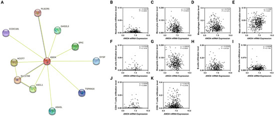 PPI network of ANO4 based on string analysis (A). The correlation between ANO4 expression and immune microenvironment (B–K).