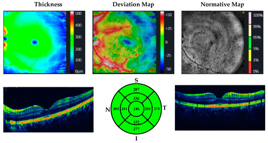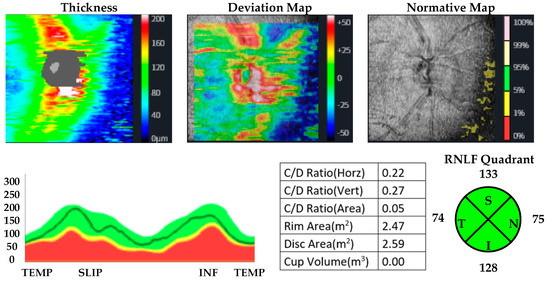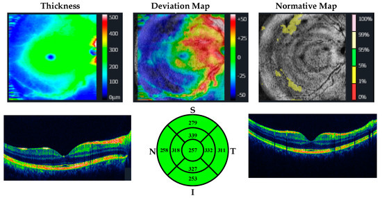 OCT measurements were performed by the same ophthalmologist for all participants. CMT, MMT, and RNLF were measured. The protocol used for measuring RNFL thickness was the optic disc cube with circumpapillary RNFL thickness measurements calculated from a circular scan with a diameter of 3.46 mm (10.87 mm in length) automatically placed around the optic disc. The macular thickness was acquired using the macular cube 512 × 128 protocol, where a 6 × 6 mm macular area is covered, collecting 512 × 128 scans (horizontal and vertical). The axial lengths of the patients and controls were measured by using a biometer. Huvitz 1-F was used as the optical coherence tomography device. OCT images of participants with methamphetamine use disorder and healthy participants are given in Figure 1, Figure 2, Figure 3 and Figure 4.