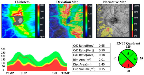 Retinal nerve fiber layer thickness evaluated by optical coherence tomography.