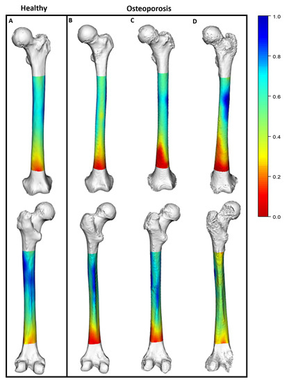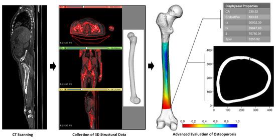 Computational analysis of the geometric properties of an osteoporotic femur’s structure has the potential to reveal key insights about morphological and biomechanical attributes at specific locations in the femur. The use of the geometric properties from long bones to study biomechanics and functional morphology originated from anthropological studies that employed manual data collection techniques [20]. Over the decades, these underlying principles have been combined with sophisticated digital imaging and 3D modeling techniques to permit improved data collection and data analysis [21,22]. This approach has been used to support the study of the evolution, locomotor capabilities, and behavior of humans as well as other species [23,24,25]. These computational evaluations have also been used to detect changes in healthy long bones due to distinct habitual loading (i.e., bone functional adaptation) patterns, such as the identification of differences in the lower limb bone characteristics of athletes from various sports [26,27,28,29].