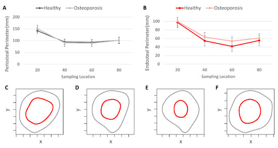 Perimeter data from the healthy and osteoporosis experimental groups. (A) Periosteal perimeter data. (B) Endosteal perimeter data. (C) Periosteal and endosteal perimeters at 80% biomechanical length (BL). (D) Periosteal and endosteal perimeters at 60% BL. (E) Periosteal and endosteal perimeters at 40% BL. (F) Periosteal and endosteal perimeters at 20% BL. Cross-section perimeter examples from a healthy femur.