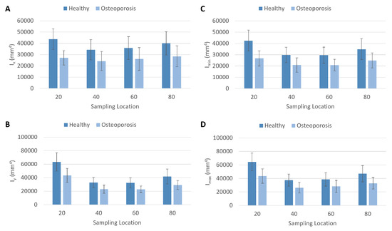 Plots of area moment of inertia data from the healthy and osteoporosis experimental groups. (A) Area moment of inertia around the x axis . (B) Area moment of inertia around the y axis . (C) Minimum area moment of inertia . (D) Maximum area moment of inertia . Sampling location = percentage of biomechanical length.