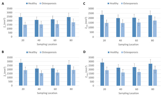 Plots of section modulus data from the healthy and osteoporosis experimental groups. (A) Section modulus about the x axis . (B) Section modulus about the y axis . (C) Minimum section modulus . (D) Maximum section modulus . Sampling location = percentage of biomechanical length.