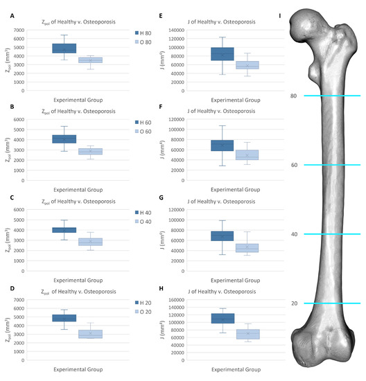 Biomechanical data of the healthy and osteoporosis experimental groups at four sampling locations along the biomechanical length (BL) of the femur. (A) Polar section modulus at 80% BL. (B) at 60% BL. (C) at 40% BL. (D) at 20% BL. (E) Polar moment of inertia (J) at 80% BL. (F) J at 60% BL. (G) J at 40% BL. (H) J at 20% BL. (I) Femur 3D model showing sampling locations (blue).