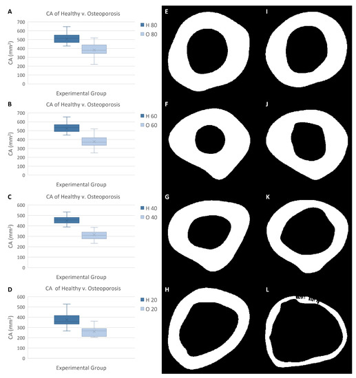 Cortical area (CA) data of healthy and osteoporosis experimental groups. (A) CA data from 80% biomechanical length (BL). (B) CA from 60% BL. (C) CA from 40% BL. (D) CA from 20% BL. (E) Healthy femur CA (shown in white) at 80% BL. (F) Healthy femur CA at 60% BL. (G) Healthy femur CA at 40% BL. (H) Healthy femur CA at 20% BL. (I) Osteoporotic femur CA at 80% BL. (J) Osteoporotic femur CA at 60% BL. (K) Osteoporotic femur CA at 40% BL. (L) Osteoporotic femur CA at 20% BL.