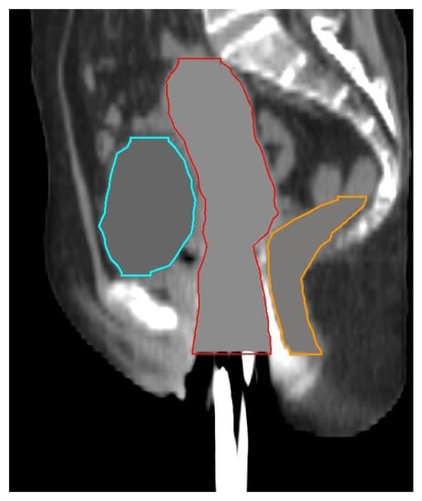 An example of sagittal BT image after preprocessing. The cyan, orange, and red contours represent bladder, rectum, and U + V, respectively.