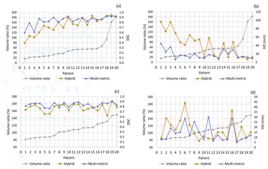The changes of DSC (a) and HD (b) values with respect to the volume ratio of BT to EBRT for bladder and those (c,d) for rectum. Note that the orders of the patients between (a,b) and (c,d) are different.