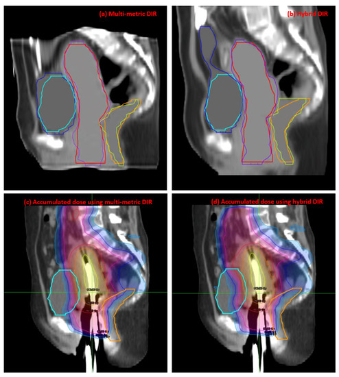 The registration results (a,b) achieved by the multi-metric and hybrid DIR methods, respectively, and their corresponding accumulated dose distributions (c,d) for one patient. The reference bladder, rectum, and U + V are shown in cyan, orange, and red, respectively, and the corresponding deformed contours are shown in blue, yellow, and pink, respectively.