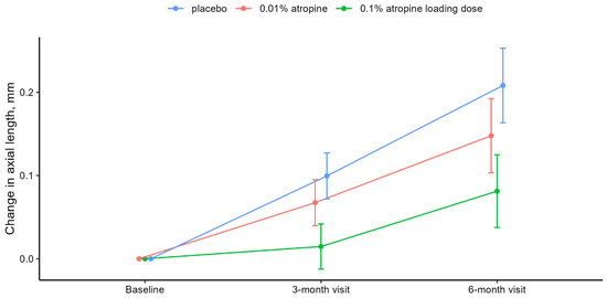 Change in AL from baseline. Notes: Mean change in axial length from baseline to six-month visit with placebo (blue), 0.01% atropine (red), and 0.1% atropine loading dose (green). Error bars denote the 95% CIs of the mean changes. Means and CIs are derived from the constrained linear mixed model with inherent baseline adjustment. P and adj-P values are presented in Table 2. Abbreviations: adj-P = adjusted P; CI = confidence interval.