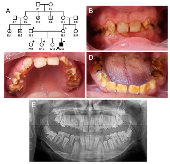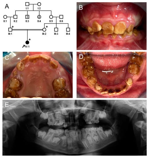 The proband of family 4 was a 10-year-old female from a consanguineous Turkish family (Figure 7). She had no remarkable past medical history. Her deciduous and permanent dentition had a dark brown discoloration and exhibited enamel breakdown and accelerated attritions. There were black stains throughout the dentition. She had no kidney symptoms, and the pediatric nephrology department confirmed that she had no acidosis, and her renal and tubule functions were normal. She was the only affected individual in her family; therefore, a recessive or de novo mutation was suspected.