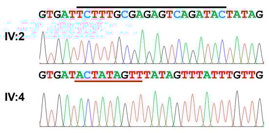 Sequencing chromatograms. Normal nucleotides (marked with a black bar above the sequence) in the upper chromatogram of the normal individual, IV:2, are deleted, and the novel nucleotides (marked with a red bar above the sequence) are inserted in the lower chromatogram of the proband, IV:4. The deletion and insertion mutation is described as c.2680_2699delinsACTATAGTT (NM_182758.4) and p.(Ser894Thrfs*15).