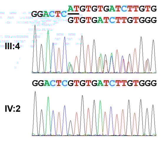 Sequencing chromatograms. Heterozygous deletion of AT (marked with a black bar under the sequence) in the normal but heterozygous individual, III:4, results in a mixed peak from the deletion. A sequencing chromatogram of the proband (IV:2) shows a homozygous AT nucleotides deletion. The deletion mutation is indicated as c.1467_1468delAT (NM_182758.4) and p.(Val491Aspfs*8).