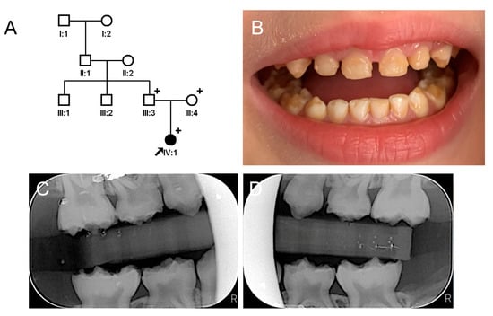 Pedigree, clinical photo, and bitewing radiographs of family 3. (A) Pedigree of family 3. The black symbol indicates the affected individual, and the proband is indicated by a black arrow. A plus sign above the symbol indicates participating individuals. (B) Clinical photo of the proband at age 4 years. She has a dull yellowish-brown discoloration of her dentition, and the affected enamel shows attrition and fractures. (C,D) Bitewing radiographs of the proband at age 4 years show enamel fractures with reduced radiopacity.