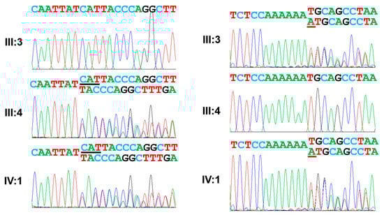 Sequencing chromatograms. The left side shows the maternal mutation (c.1287_1289del, p.(Ile430del)). Deleted nucleotides are indicated by black underline. The right side shows the paternal mutation (c.2332dupA, p.(Met778Asnfs*4)) with the duplicated nucleotide indicated by a red underline.