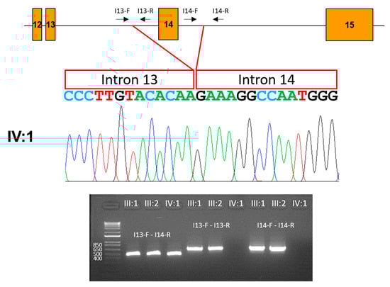 Two intra-intron PCRs and flanking PCR across exon 14 were performed to characterize the size and location of the deletion identified in family 4. The primer pairs for intra-intron 13 (656 bp) were: I13-F (forward) 5′-TCCTTATGTCATGTGTATGCC-3′ and I13-R (reverse) 5′-TAAAATTCACTGTCTTTCTGAGAAG-3′. The primer pairs for intra-intron 14 (711 bp) were: I14-F (forward) 5′-TGGCTGCATTATGCTCTATG-3′ and I14-R (reverse) 5′-GGTACTCTGCTGGGCTGAAA-3′. Flanking PCR was performed with the I13-F and I14-R primers (475 bp only in the mutant allele). Each amplification band was sequenced by Sanger sequencing at Eurofins Genomics.