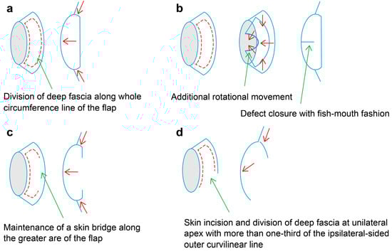 A basic illustration of the four modifications of the keystone perforator island flap (KPIF) used in this study. (a) Modified Type II KPIF. (b) Omega variation closure (OVC) KPIF. (c) Sydney melanoma unit modification (SMUM) KPIF. (d) Hemi-KPIF. Red dotted lines represent the division of deep fascia, and red arrows represent the direction of flap movement. (Reprinted from Keun Hyung Kim et al. [11], with permission from Hindawi).