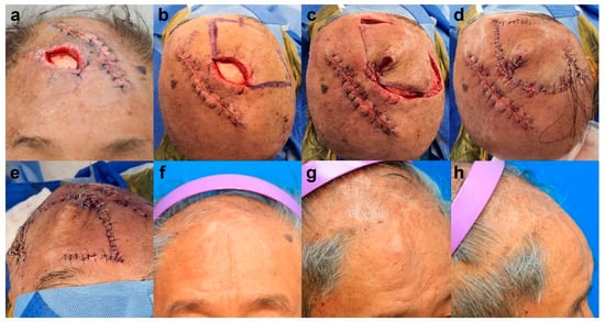 The scalp and forehead are unique dome-shaped components of the upper part of the head, which covers the cranium and the underlying brain [1]. Their underlying structures are similar despite regional differences affecting the reconstruction approach [1]. The tissue tautness caused by the convexity of the scalp and forehead frequently results in challenging defects that can be difficult to repair [1,2,3,4]. Primary closure is usually possible only for small scalp and forehead defects with a diameter of approximately 2–3 cm [1,5]. Diverse scalp and forehead reconstruction options have been developed, including skin grafting, dermal substitutes, tissue expander, locoregional flaps, and microvascular tissue transfer [1,2,3,4]. Skin grafting and dermal substitutes can be reliable for any superficial defect because of the rich blood supply to the scalp and forehead [6]. Flap surgery is essential for adequate coverage of deep defects where the underlying structures are exposed [6]. The local flap technique is typically helpful for covering small- to moderate-sized defects. Moreover, microvascular tissue transfer can be used for large-to-extensive defect coverage of the scalp and forehead [7,8]. Therefore, the free flap technique is the best reconstruction approach, particularly when covering areas with exposed alloplastic materials and neurocranial structures [8].