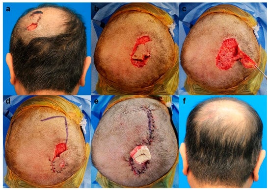 - Julian, J.P.; Edward, J.C. Scalp and forehead reconstruction. In Plastic Surgery: Craniofacial, Head and Neck Surgery and Plastic Surgery, 4th ed.; Rodriguez, E.D., Neligan, P.C., Eds.; Elsevier: Amsterdam, Netherlands, 2017; Volume 3, pp. 92–132. [Google Scholar]