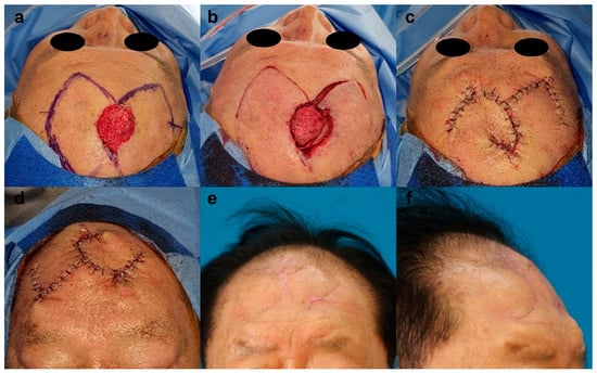 - Kruse-Losler, B.; Presser, D.; Meyer, U.; Schul, C.; Luger, T.; Joos, U. Reconstruction of large defects on the scalp and forehead as an interdisciplinary challenge: Experience in the management of 39 cases. Eur. J. Surg. Oncol. 2006, 32, 1006–1014. [Google Scholar] [CrossRef] [PubMed]