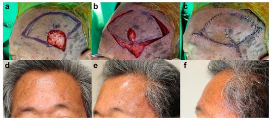 Clinical photographs of case 9. (a) Skin defect (4 cm × 4.5 cm) in the temporal forehead, and design of the keystone perforator island flaps (KPIF) (6.5 cm × 12 cm) from the temporoparietal scalp and lateral forehead. (b,c) Successful defect coverage with the Sydney melanoma unit modification and omega variation closure KPIF. (d–f) Postoperative photographs after an 8-month follow-up.
