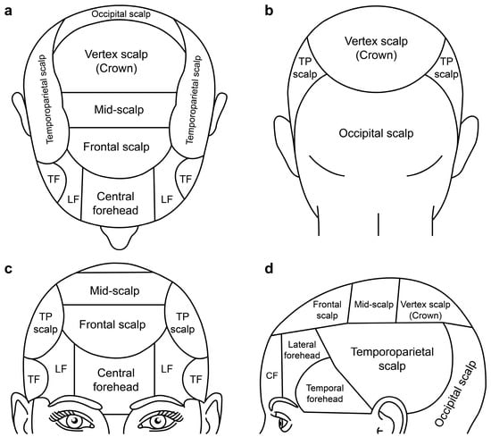Schematic illustrations of anatomic regions in the scalp and forehead. (a) Top view of the head. (b) Posterior view of the head. (c) Anterior view of the head. (d) Lateral view of the head. TF, temporal forehead; LF, lateral forehead; TP, temporoparietal; CF, central forehead.