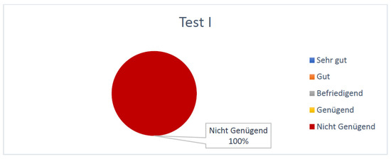 At the first test (taken before the simulation training) students achieved an average of 23.4 points (±6.1) out of a maximum score of 64. According to the equivalence key for grades (Table 1) all the students (100%) received the lowest grade, “Nicht genügend”/“F” (Figure 2).