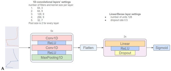 (A)—Model Architecture: The One-Dimensional Convolutional Neural Network (1D-CNN) consists of 5 convolutional blocks and 2 densely-connected layers. Each convolutional block applies a 1D convolution and a Rectified Linear Unit (ReLU) activation function twice, and then a 1D max pooling operation. The output of the convolutional blocks is flattened and sent to the densely-connected layers, which are composed of a linear transformation, a ReLU activation function and a dropout operation. Finally, the probability distribution for the two output classes is generated by a single neuron with a sigmoid activation function. (B)—Block diagram.