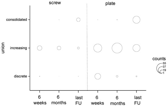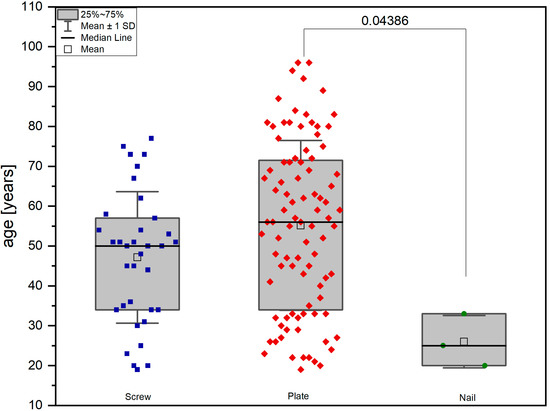 There were some limitations to this study that deserve consideration. The retrospective character of the study limited the precision of the data and means that all surgical treatments and chosen implants were at the discretion of the operating surgeon. The nature of a single-center study limited the achievable data as well. Respecting the eligibility of inclusion criteria led to a high number of excluded patients. As distal shaft fractures were excluded from the presented cohort study, the number of patients who were managed with an intramedullary nailing system was low and could not be considered for statistical analysis. The group size of patients managed with plating systems was almost three times larger than the comparison group of screw fixation. Hence, the statistical outcome was critical to discuss and allowed clinical relevance rather than statistical relevance. Additionally, although we found multiple independent variables that predicted healing complications, such as soft tissue damage or patient’s age, multiple independent variables that predict healing complications were not analyzed (e.g., use of corticosteroids).