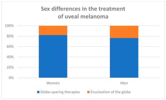 To the best of our knowledge, this is the first study of uveal melanoma showing the sex differences in the treatment of this malignant tumor. In total, 1336 patients were diagnosed with uveal melanoma and treated between 2018 and 2021 in the national referral center (Department of Ophthalmology and Ophthalmic Oncology, Jagiellonian University Collegium Medicum, Krakow, Poland), and the majority were women (54.34% of patients). According to data from the National Cancer Registry (NCR) of Poland, our sample was a fair representation of the uveal melanoma population in Poland in terms of sex distribution (statistical analysis—Chi squared test: χ2 = 0.20, p = 0.6570) [13]. NCR data also revealed that the incidence rate of uveal melanoma in the whole population of Poland is 6.67/1,000,000 person-years, with the majority of patients with ocular melanoma in Poland being women (53.57%) [13]. In other large, demographic-relevant studies such as the SEER-based reports by Singh et al., Bishop et al., and Mahendraraj et al., the age-adjusted incidence rate of ocular melanoma was significantly higher in men [23,24,25]. In Australia, the difference in the incidence of ocular melanoma between sexes was largely due to significantly higher rates in men aged 65 years and older. There were no significant differences in incidence rates between men and women younger than 65 years [26].