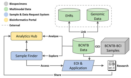 The BCNTB integrated Biospecimen and Data Request System offers real-time information on the availability of biospecimens and data to researchers, while simplifying the data sharing process to maximise data reuse. The BCNTB integrated Bioinformatics Portal enables the research community not only to access high-quality annotated biospecimens, but also to interrogate the associated data. Analysing various types of data available for each patient is key to implementing personalised diagnostic, prognostic and therapeutic strategies. It reduces research time and complexity, while the seamless data exchange and navigation between Sample Finder and Analytics Hub helps overcome the barriers due to lack of data compatibility. This created a domain-specific repository of breast cancer data and tools that can be used to generate clinical and molecular patient journey narratives. Such narratives offer context and a cross-functional view of patient experience that cannot be achieved without employing these tools and by interrogating data from either source alone, or engage all stakeholders to identify gaps in breast cancer care.