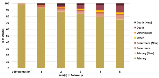 Evolution of disease status in BCNTB-BCI donors over 5 years of follow-up (the ‘Other’ category consists of cosmetic and high-risk cases; new and existing cases at the end of each follow-up year are shown separately).