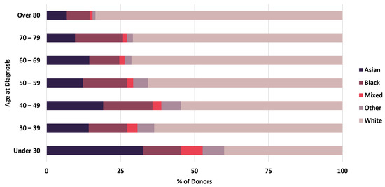 Linkage of BCNTB-BCI data to EHRs allows a quick inspection of the breast cancer landscape in our consented cohort. We selected a subset of BCNTB-BCI donors (data extracted on 22 September 2022) who have been followed up for at least 5 years or until death (whichever is earlier) and for whom age at diagnosis, ethnicity, disease and survival status data are available and independently verified throughout this period (n = 1066). Figure 2, Figure 3 and Figure 4 show the evolution of disease status in this subset of donors over 5 years of follow-up (the period during which risk of breast cancer recurrence is high), the prevalence and co-occurrence of conditions that are often comorbid with breast cancer in these patients, and their age at diagnosis of primary breast cancer and ethnicity, respectively. Our results suggest that breast cancer screening uptake in the consented population of East London covered by BH is low, resulting in many cases presenting at later stages of the disease. For instance, the de novo metastatic breast cancer rate is at least 2% and the incidence of recurrence is the highest in the first year after diagnosis (Figure 2). Oestrogen receptor (ER) negative breast cancer cases make up the majority of recurrence cases diagnosed in this period. Additionally, the results show that the most common comorbid condition is cardiovascular disease with a prevalence rate of 38%, followed by hypertension and rheumatic disease (Figure 3). This is in agreement with statistics reported in numerous other studies that investigated the prevalence of comorbidities in breast cancer patients (e.g., see [27]). However, our results also highlight the challenges in breast cancer detection and treatment in the multi-ethnic population of East London, where over 20% and over 30% of patients are Black and Asian [14], respectively. Overall survival of patients, comprised of relapse-free (the ‘Primary’ category) and secondary breast cancer (the ‘Recurrence’ category) cases, is worse in these ethnic groups. For example, the 5-year overall survival rate for our consented Black group is 78%, which is lower than the rate for all BCNTB-BCI donors (84%, Figure 2) and the national average of 85% [1]. Similarly, the age at diagnosis is younger particularly in the Asian and Black groups (Figure 4). In addition, the results highlight some of the challenges in breast cancer management in this region. For example, the comorbidity burden is high, with 14% of patients experiencing three or more comorbidities (Figure 3).